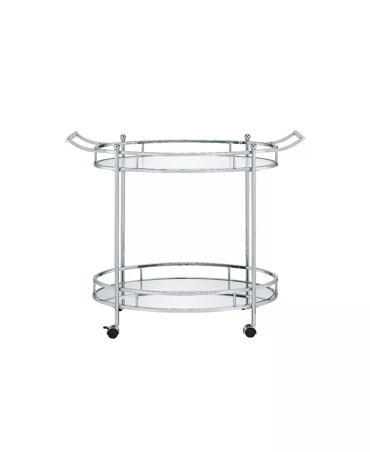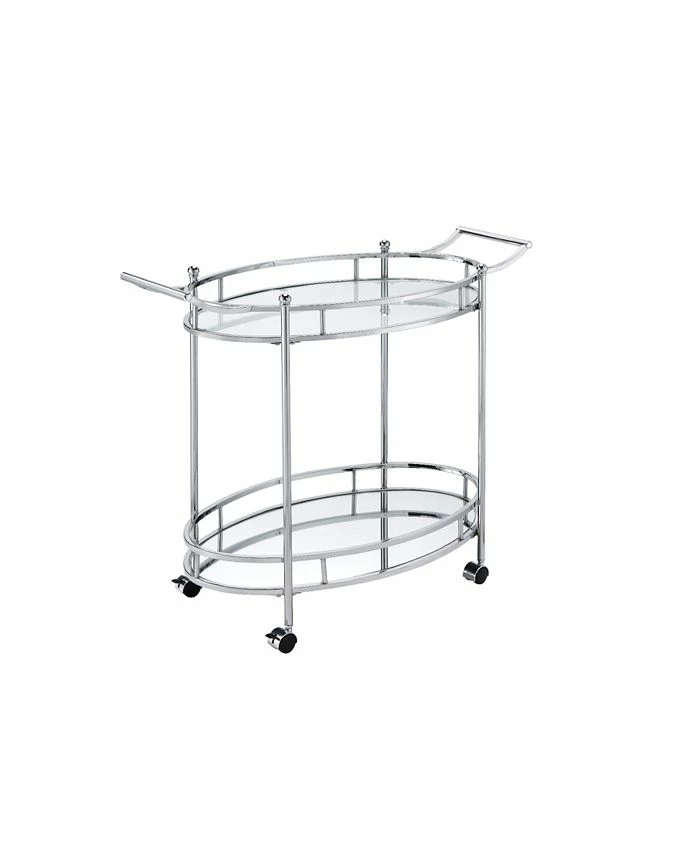 Instantly transform an ordinary room in to a minibar with this brilliant accessory. It features two clear glass shelves and a metal frame with a simplistic silhouette while the chrome finish gives it a modern touch. The two handle design and wheel stop make it easy to move around where needed.