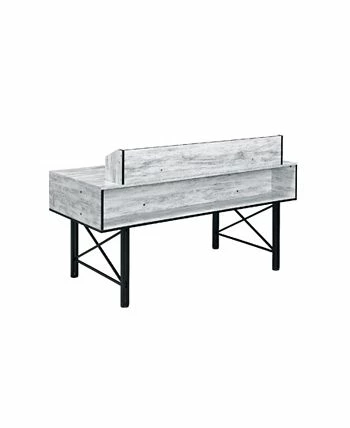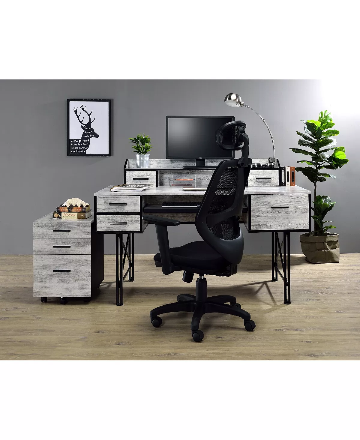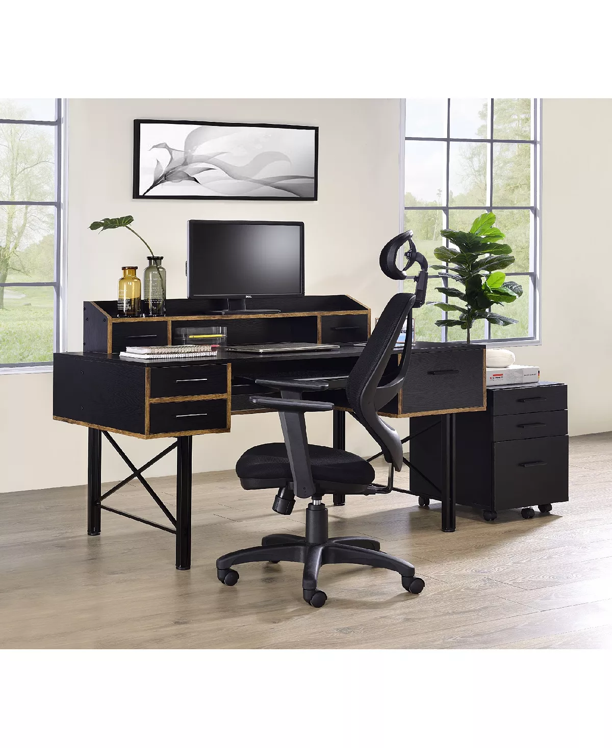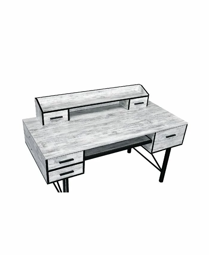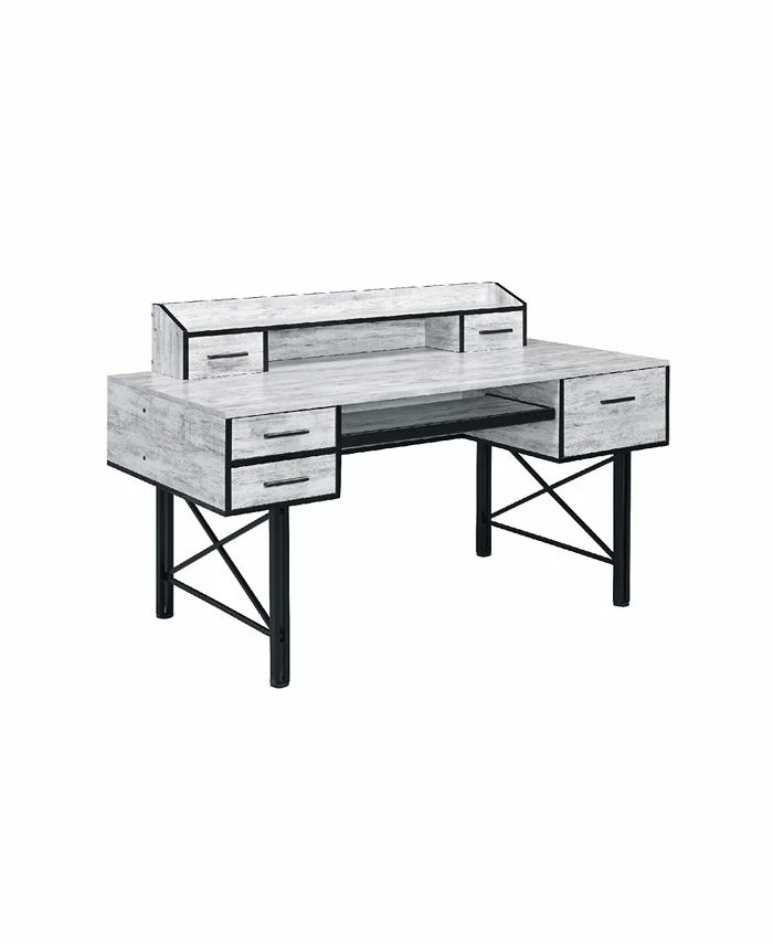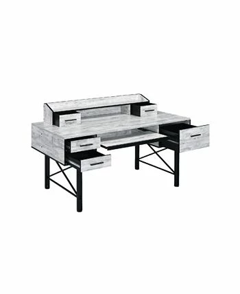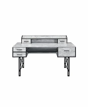 Highlighting a bold, stunning and gorgeous mix, the safea desk features rustic casegood paired with a double pedestal metal base for a interesting contrast. Above the desk, there is a low open hutch with two small drawers that allows you place a computer screen and organize office supplies.