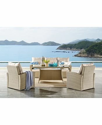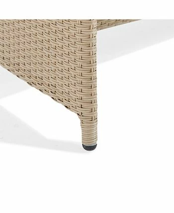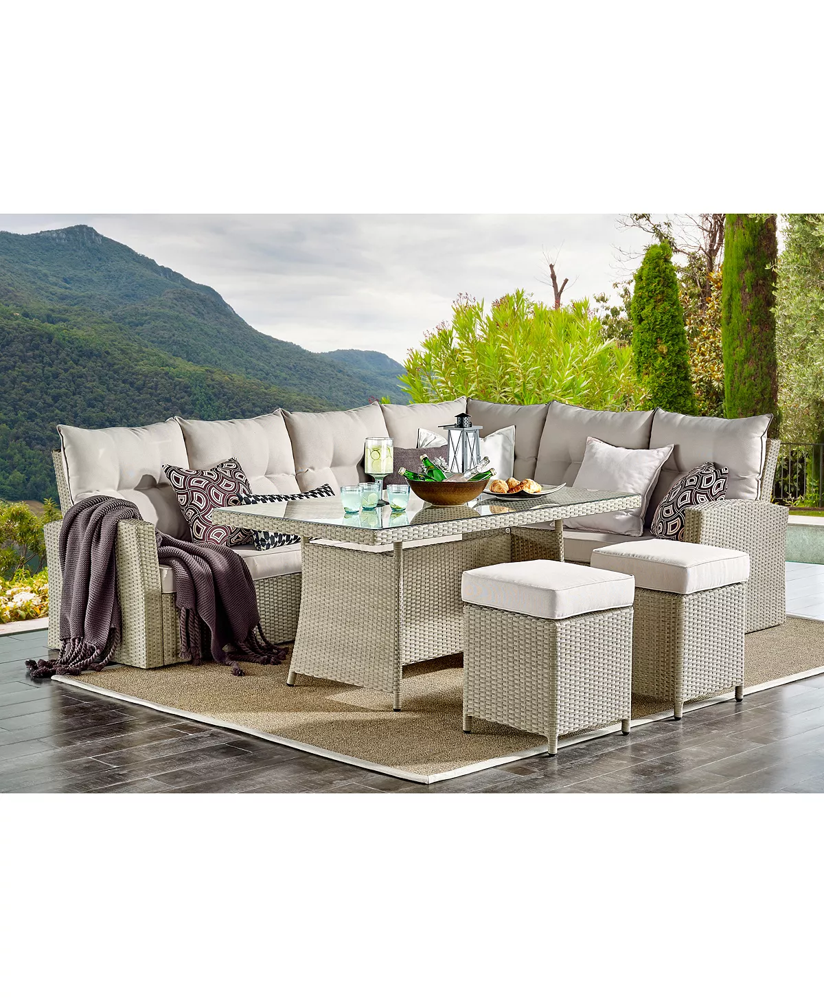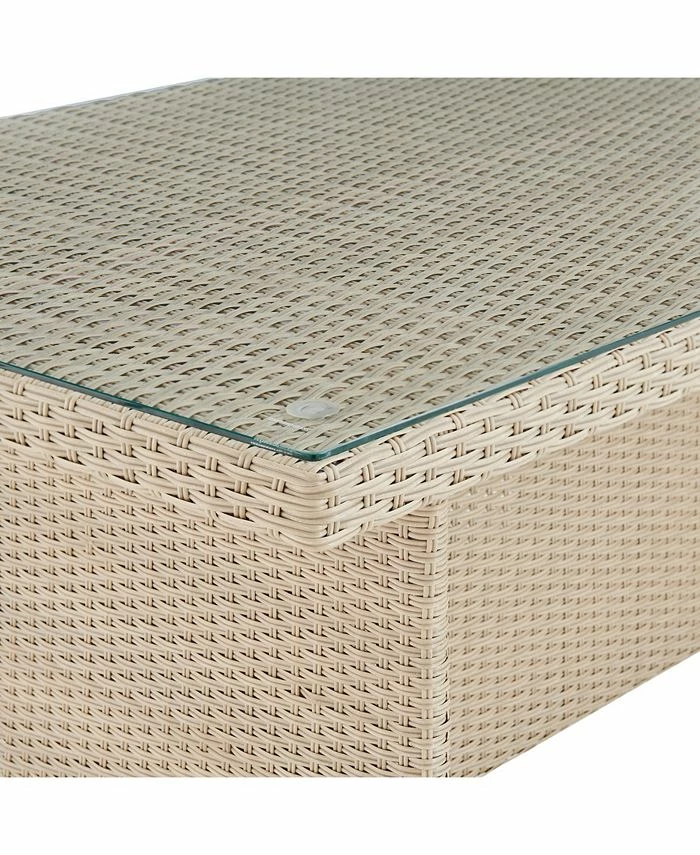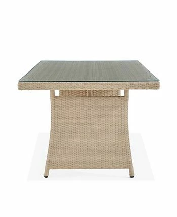 - Polyethylene resin wicker, steel, weather- resistant polyester cover, polyurethane foam, polyester fiber batting, tempered glass