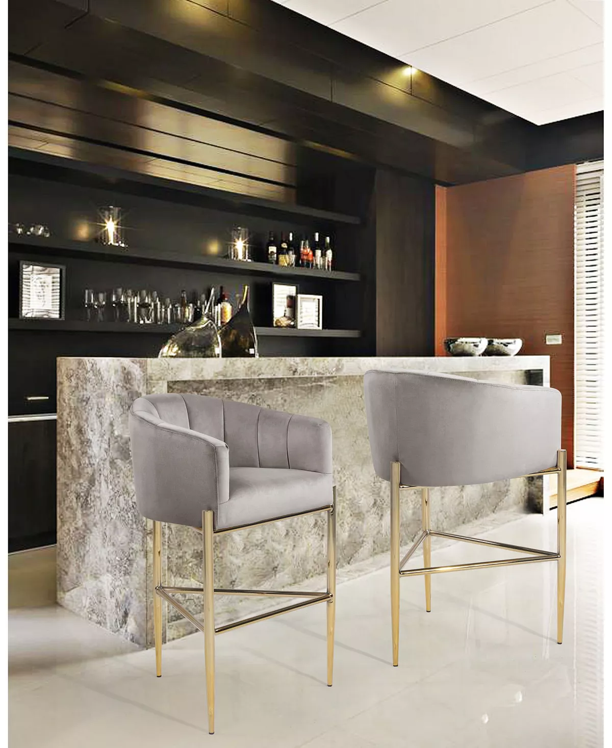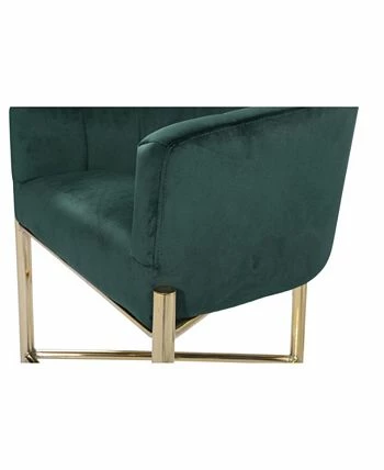 Clean architectural lines are created by a sculptural gold tone 3 legged metal frame while a curved, shelter arm velvet upholstered, vertical channel quilted seat and a footrest bar provide for superior comfort.