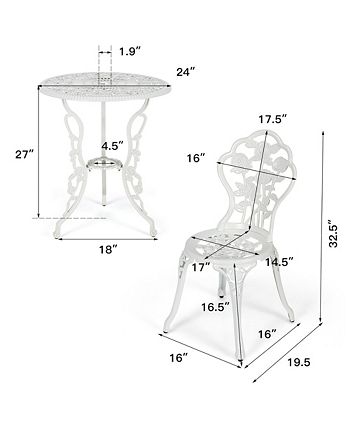 It is an eye-catching decoration on your courtyard with lovely rose scrolls blossom on the surface. Made of selected cast aluminum, this patio bistro set is built to standing on your balcony for years to come. You can stick a patio umbrella into the table for sun-shading or away from drizzles.