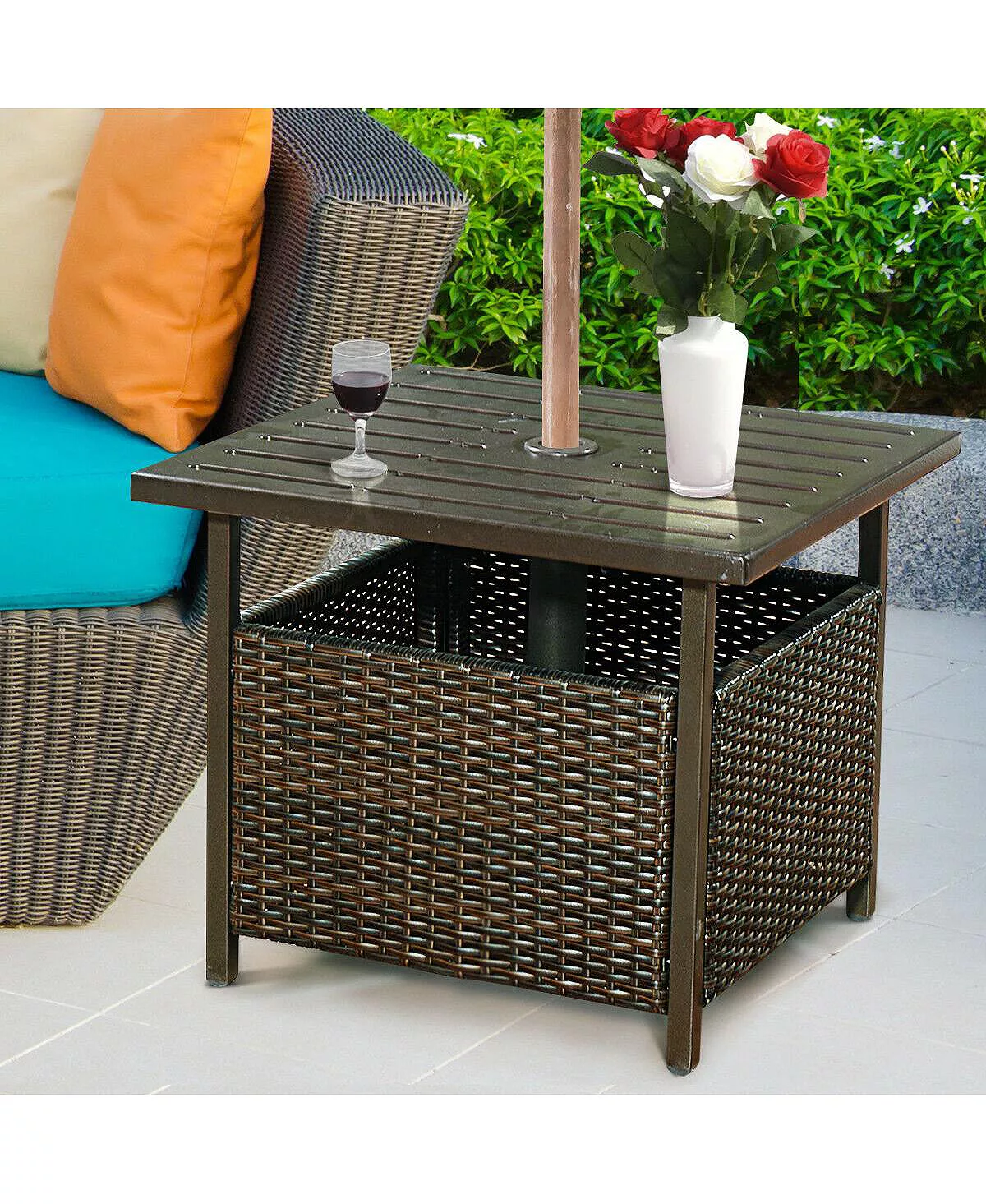 This brown rattan side table is made of high quality PE rattan material, which will be lightweight and eco-friendly. Constructed of powder-coated steel frame, our umbrella table is durable and stain resistant.