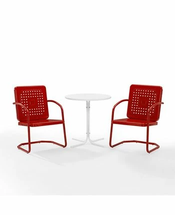 Two retro-style chairs in vibrant colors surround a simple metal bistro table for a fun and functional outdoor lounging experience. Each chair features a square back with a unique basket weave design that allows air to circulate. The table’s sturdy pedestal base is comprised of four metal legs.