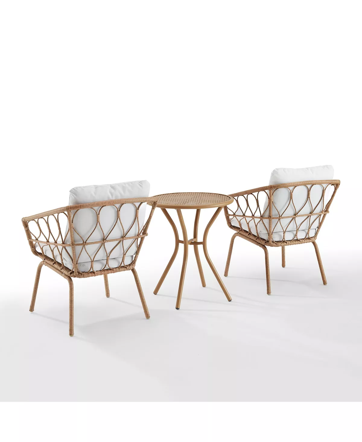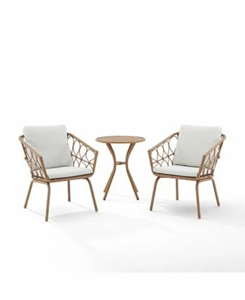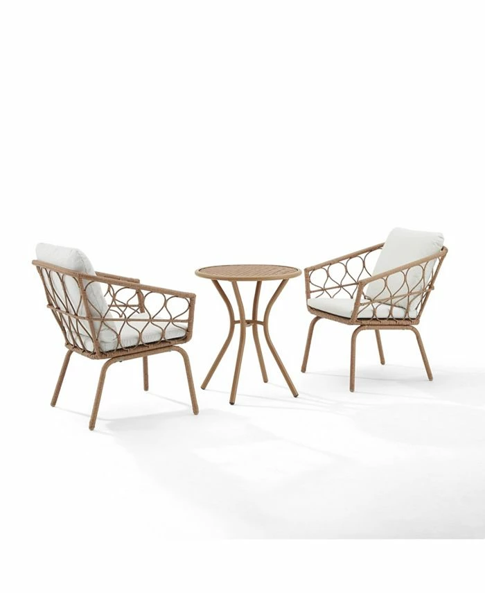 Crafted from rattan-style wicker, this set showcases delicate woven loops over frames. with lush, moisture-resistant cushions and cushion core on the armchairs and a chic round table, the Juniper bistro set will be your favorite spot for a romantic meal in the open air.
