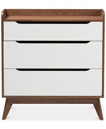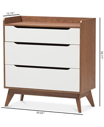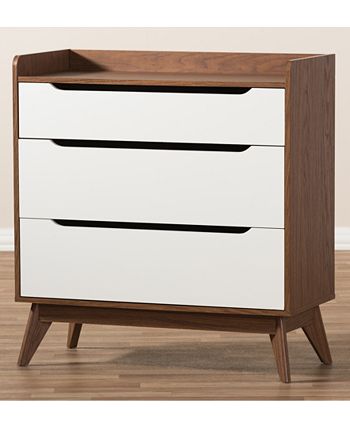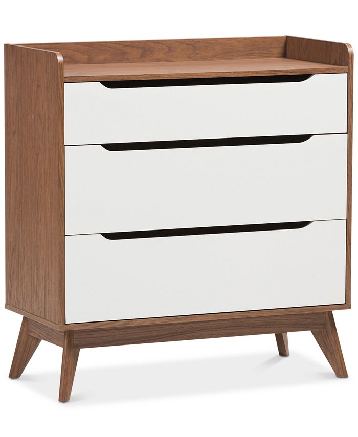 Angular legs combine with cut-out drawer handles, sleek lines and a refreshing two-tone finish to lend this three-drawer chest a bold Scandinavian-inspired touch of minimalist mid-century-modern styling along with useful functionality.