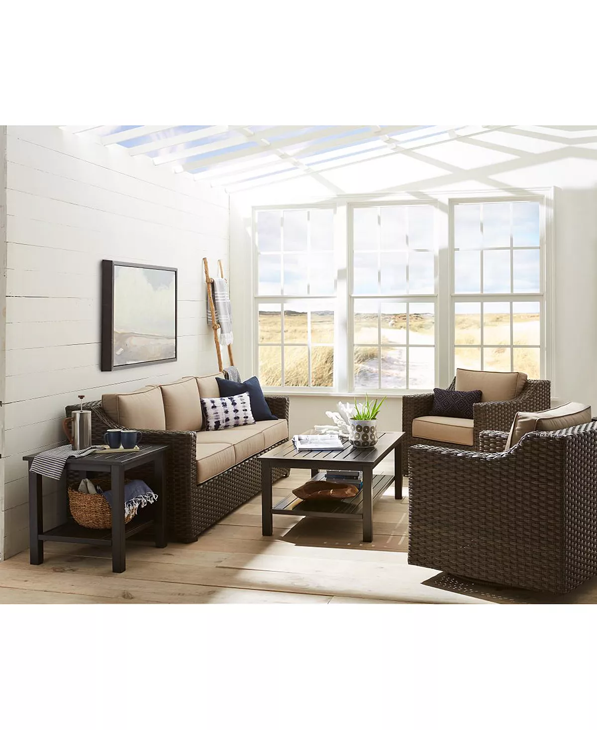 Scoop track arms and warm brown-tone wicker surfaces on this durable three-piece seating set balance traditional and contemporary style. Coupled with plush box cushions, this handsome set offers all you need to create a cozy and comfortable lounging spot in your outdoor space.