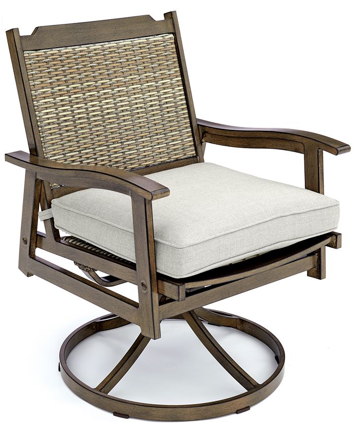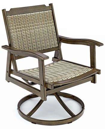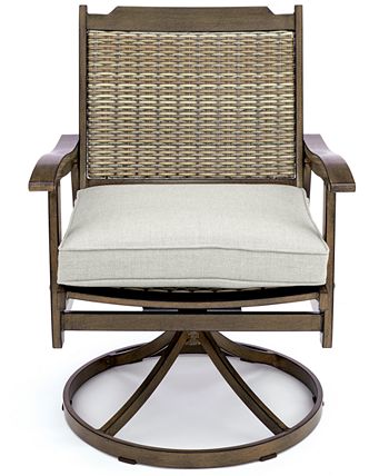 Instantly add to the outdoor seating area of your space with this fine swivel chair. Finished in a hand-applied brown-wood finish along with a slat design that combines a classic style with modern durability, it is topped and grounded with contrasting upholstered cushions for lasting comfort.