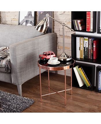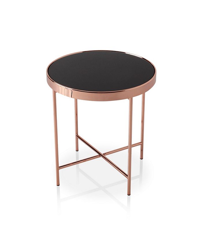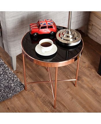 The perfect chic accessory for a stylish modern home, the Terrah Round End Table features a sturdy rose gold metal frame with a black glass tabletop insert. Its sleek two tone finish makes a unique addition to your home and amplifies your home decor. A stunning and contemporary design to beautifully accessorize your home.