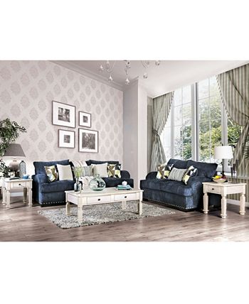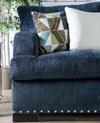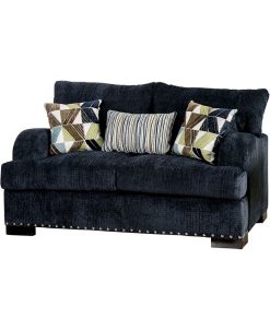 Gorgeous navy linen-like fabric covers this stylish contemporary love seat, a great option for a casual living space. Sink into comfy t-cushions and loose back cushions and against sheltered arms, enjoying plush padding over solid wood construction dressed up with nailhead edge trim.
