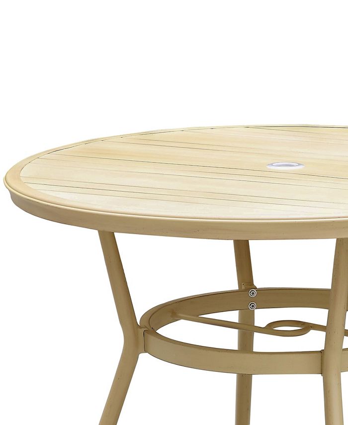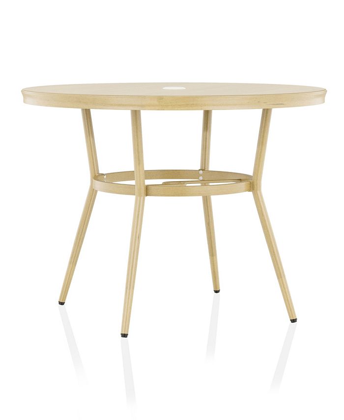Create the perfect place to settle down for dinner al fresco with this outdoor dining table. It’s complete with a center hole and lower support for a patio umbrella, allowing enjoyment out of the bright sunshine. A natural finish blends into any decor.