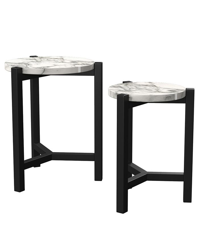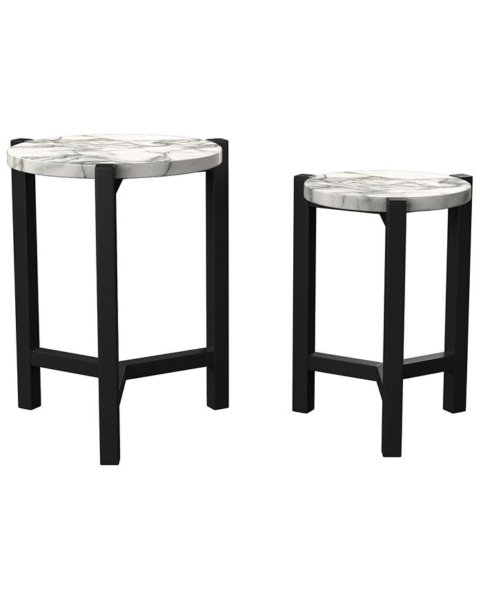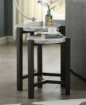 Faux marble reinforces the elegant look of this contemporary nesting table set. One small and one large, each table boasts clean lines and a brushed brown wood finish while wishbone-style braces complement tripod legs and a round tabletop.