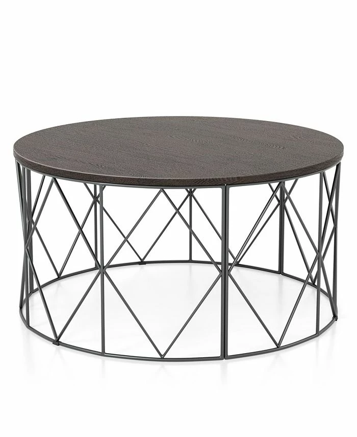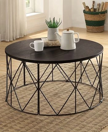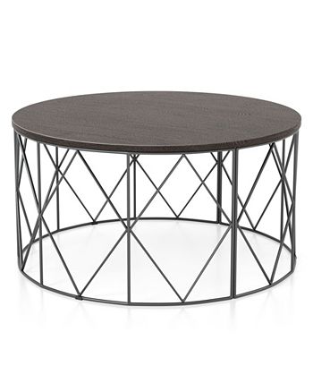 This round coffee table lends a minimalist look to a transitional living room. With a straight cylinder base with a diamond motif, it sits nicely within any seating arrangement. Available in two tabletop finishes, this coffee table works effortlessly in a modern or rustic style home.