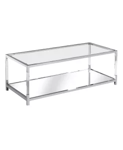 Create a glamorous airy aesthetic with the jask coffee table. Framed by sophisticated clear acrylic supports with lustrous chrome accents the coffee table provides versatile storage and decor space with an elegant tempered glass top and stunning mirrored shelf. Add a touch of glamour with the eye-catching jask coffee table.