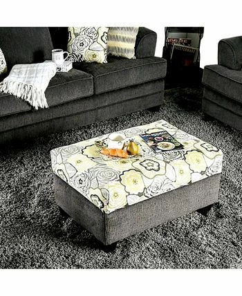 Add comfort to your living room with this classic-structured ottoman. While this piece may seem like your everyday ottoman style, the two-tone fabric combination of dark gray and green flora print stands out beautifully against the dark wooden legs.