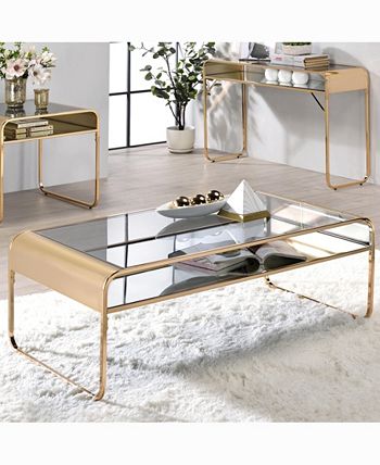 Ultra-modern with subtle industrial hardware accents, this steel coffee table features rounded edges for a sleek profile. The expansive tempered glass top sits atop the lower mirrored display shelf in this open and airy centerpiece.