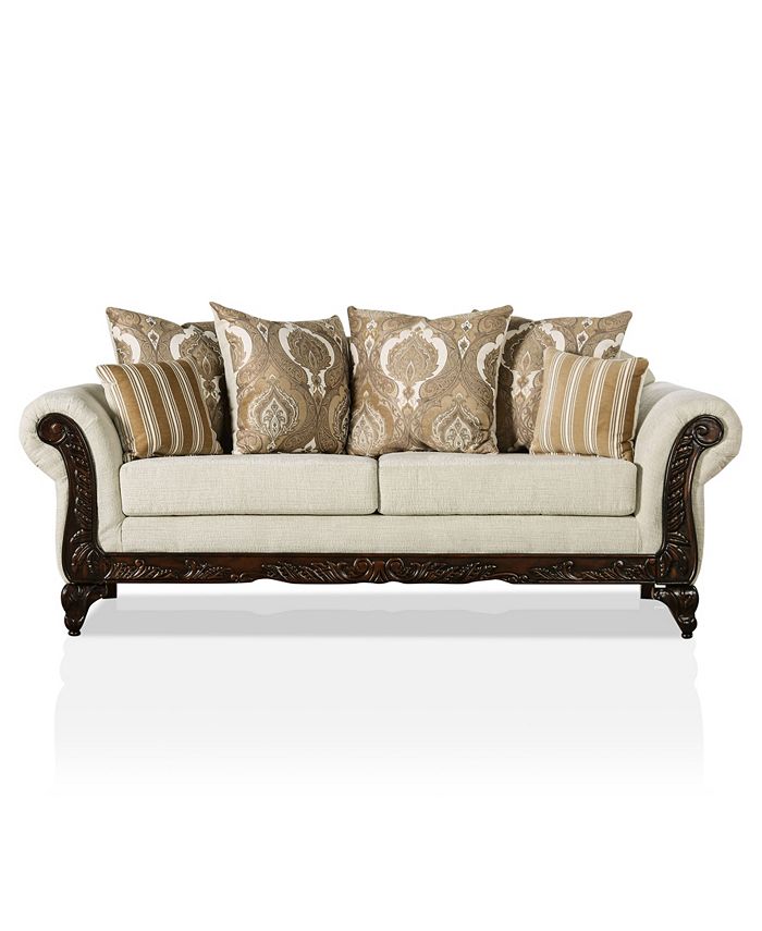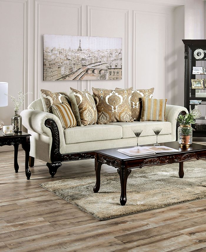 An elegant blend of comfort and style, this traditional sofa showcases subtle cream colored upholstery punctuated with dramatic black accents. Plush cushions and accent pillows create a cozy and glamorous lounge space that invites you to sink right in.