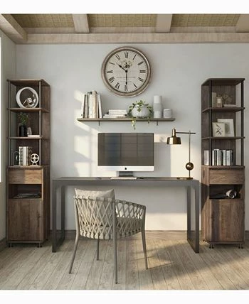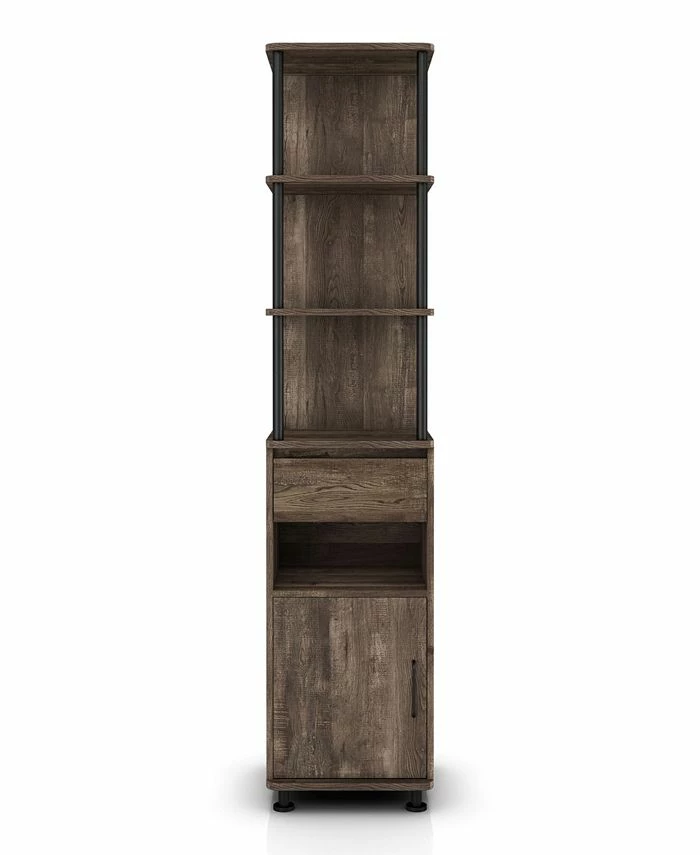 Distressed walnut varnish and black water pipe metal accents blend together to form an industrial-style TV bookcase. The wood frame is constructed with four open shelves, one center drawer, and one bottom cabinet.