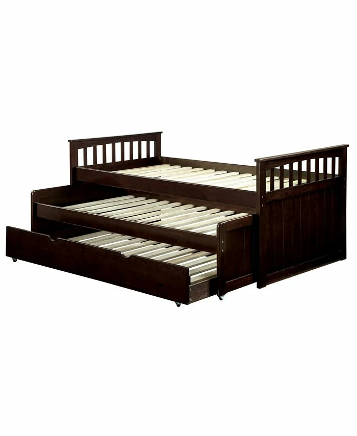 When surprise company comes to stay the night, always be ready with a place for them to sleep with this daybed! A second daybed lies just beneath the top bed, conserving space all while adding even mores sleeping spaces for your guests to use. The slatted headboard and footboard add a distinct country feeling that is further enhanced by the plank-style detailing along the sides. Finished in a warm walnut hue, this piece#8217;s lower bed is easily pulled out into place atop its sturdy caster wheel feet.
