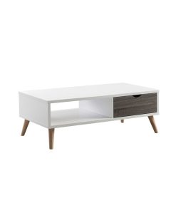 Spacious and stylish, this coffee table adds some bright contemporary charm to your home décor. A set of tapered and angling legs easily support the entire piece, their unfinished appearance helping to keep the attention on the two-tone color scheme. The storage drawer with its cut-out drawer pulls offers a perfect place to keep remotes or books where they won’t get in the way but can easily be reached. With a wide and convenient shelf to accompany the dual-sided storage drawer, this coffee table is sure to become an integral piece of your living room décor.