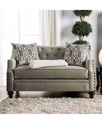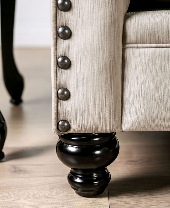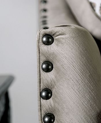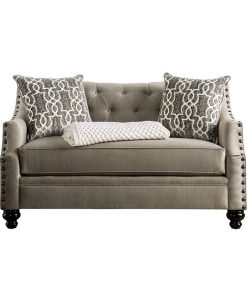 Decked out with prominent nailhead trim that refines its reverse camelback silhouette, this light brown chenille upholstered love seat offers a sweet transitional motif and a central focus in any room.
