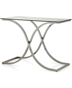 Welcome light into your living room with the Sarif Glass Console Table in Chrome. Interlocking metal brushed supports create an aesthetic that is luxuriously sleek. The 10mm tempered glass top of this sofa table provides a spot to place decor, drinks, magazines, and more on its clear surface. Solid metal construction ensures a durable frame and the modern design of this lovely console table elevates your home to refined sophistication.