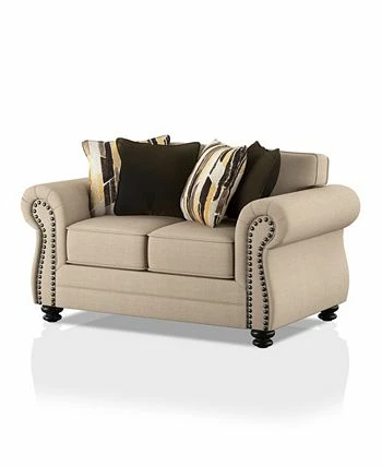 Don’t fret over the next light brown loveseat to add to your living area. This loveseat is completes with soft pillow style cushions and corded trim. Nail head trim adorns the arms while it sits on beautiful bun style feet. Further perk up the appearance of this item with the patterned pillows.