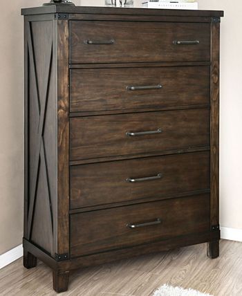 A ruggedly handsome storage piece for your rustic or casual bedroom, this five-drawer chest delivers contemporary design wrapped in a handsome dark walnut finish. Streamlined silver metal drawer handles add a cool accent to contrast beautifully with the wood.