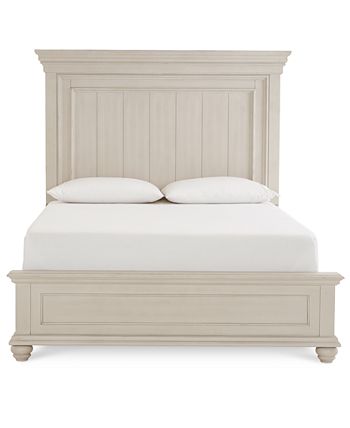 A paneled headboard, framed footboard and ornate molded lines executed in an antique grey finish imbue this king bed with a distinctly classic look that combines casual coastal cottage flair with stately southern-inspired design.