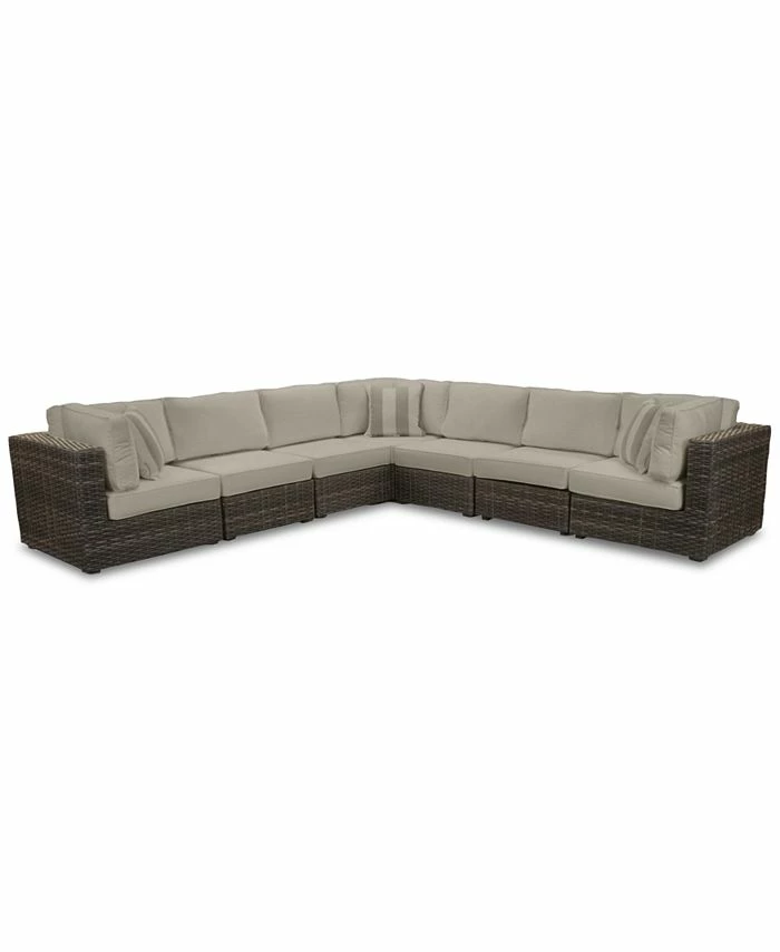 The clean lines and rich driftwood finish wicker frame of this seven-piece modular seating set make it ideal for creating an oasis of comfort and style in your outdoor space. Plush and durable contrasting Sunbrella® cushions complete the refreshing aesthetic.