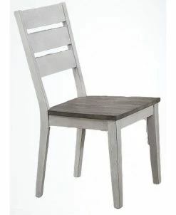 This contemporary chair has clean lines with straight forward forms. The contoured wooden seat adds a touch of comfort to the modern style. Gray two tone wash seat. Antique white with light gray undertones frame.