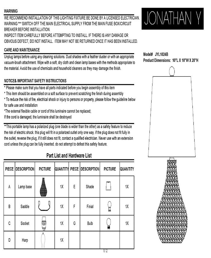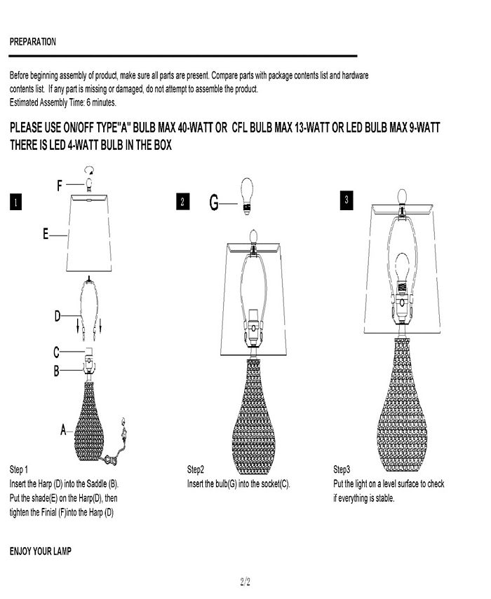 - Takes one maximum 40 watt or equivalent bulb
