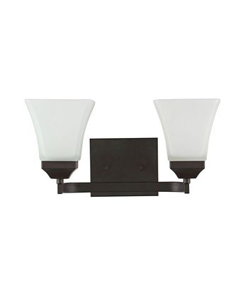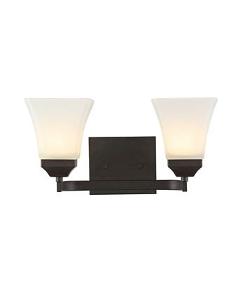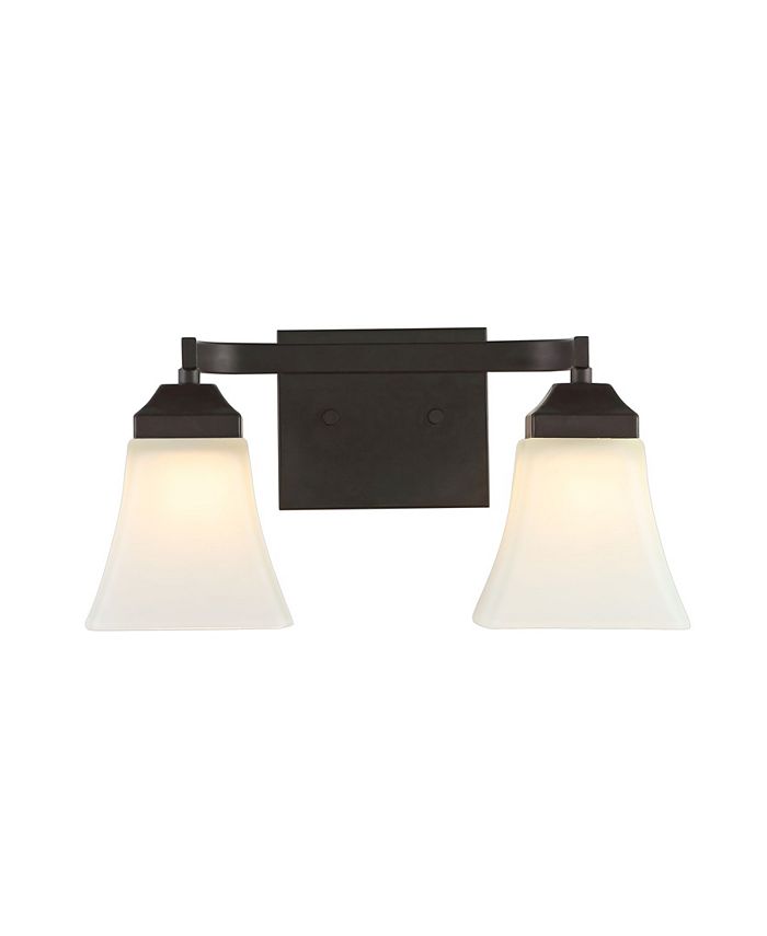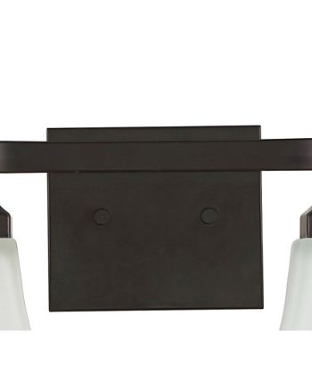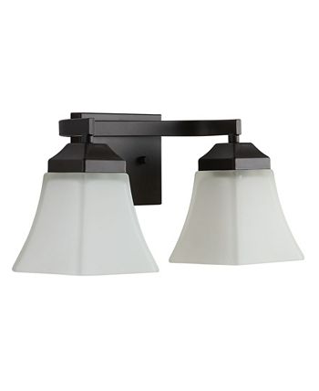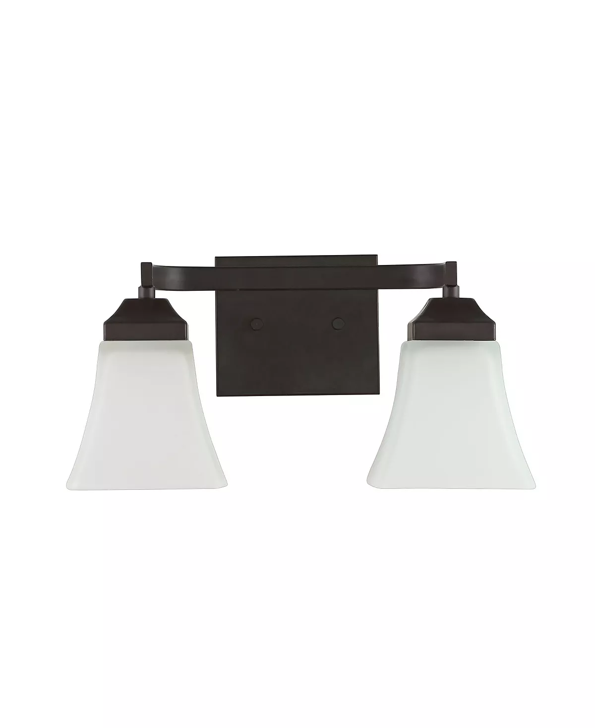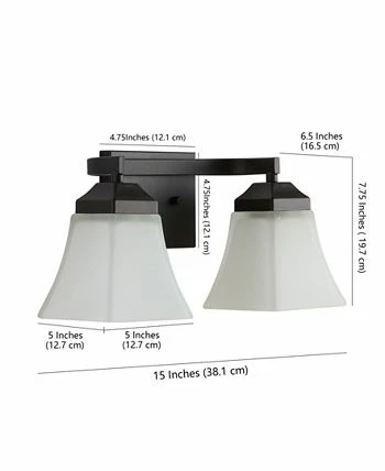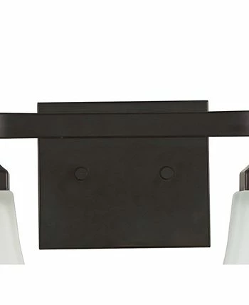 The squared lines of this 2-light vanity fixture give it a pared-down traditional look. A soft black finish and flared shades add low-key vintage-like style over a bathroom mirror. Frosted glass provides soft, diffused light from the bright LED bulbs.