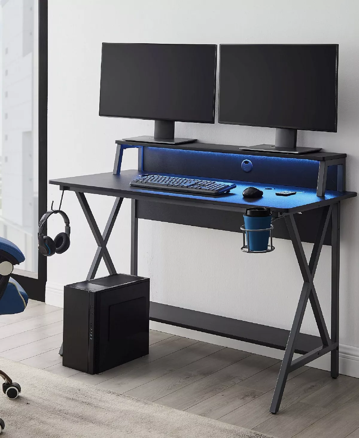 Decked out with features to maximize your gaming experience and overall organization, this versatile piece has a cup holder and wireless charging station are found on the right, while a headset hook and utensil holder are on the left.