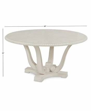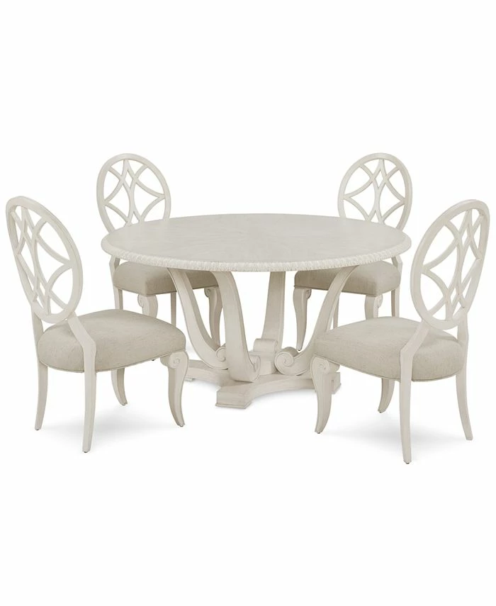 Recall the splendor of the past while presenting modern fashion in your dining space with this gorgeous five-piece set. Scrolled legs beautifully support the ornate oval back upholstered chairs and table which is accented by a sunburst pattern on top and egg and dart molding along around its lip. In warm brown or crisp, distressed white, this set is sure to charm.