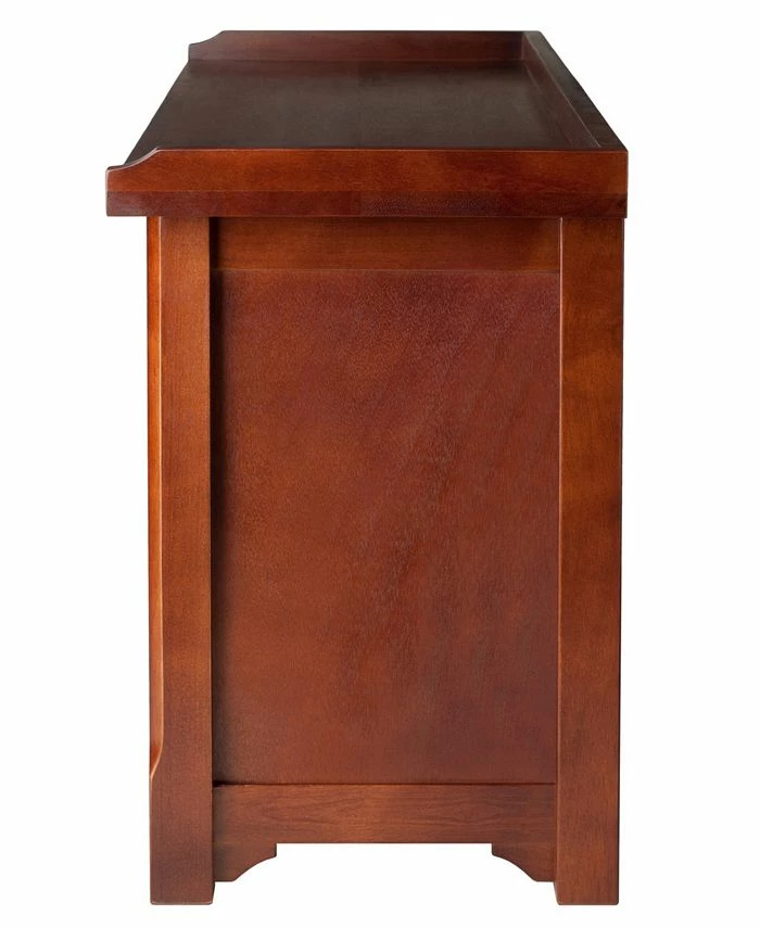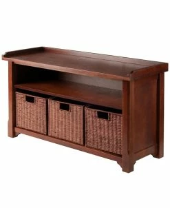 Elegant and versatile, this hall bench and baskets is perfect for entry way or mud room. 3 wired baskets sturdy construction. Bench is made of solid wood finish in antique walnut stain. Bench is ready to assemble.